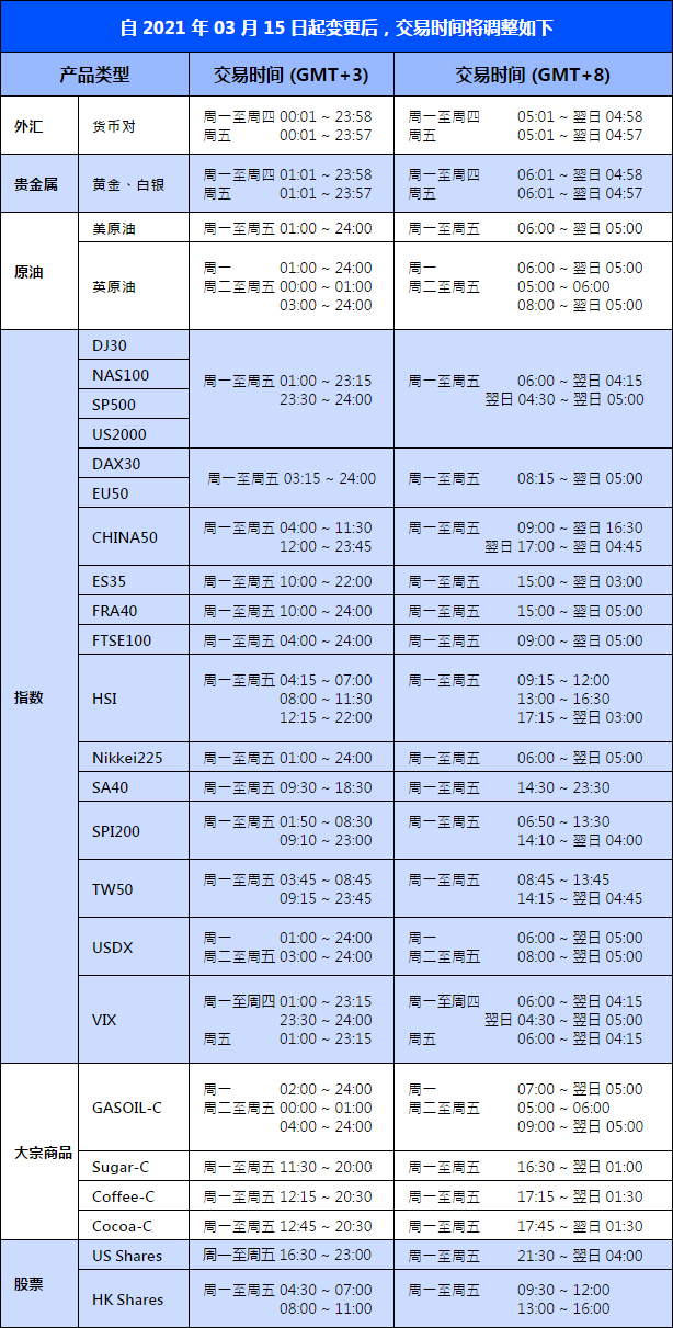 如果您正在使用需要手动设置GMT标准时间偏差的智能交易/自动化交易系统,请确保在变更前将时间偏差调整为GMT+3小时,实际交易时间,请以MT4交易软件为准。
