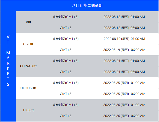 VT Markets 平台的期货产品:VIX(波动率指数)、CL-OIL(原油期货)、CHINA50ft(新华富时50期货)、UKOUSDft(布兰特原油期货)、HK50ft(香港恒生50期货) 即将于以下时间展开新合约,如持仓过夜将会收取展期费用。