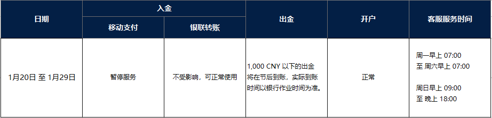 2.春节期间,入金不受影响,仅移动支付暂停服务。