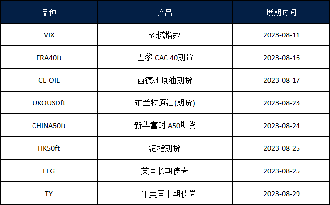 VT Markets 平台的期货产品:VIX (恐慌指数) , FRA40ft (巴黎 CAC 40期貨) ,CL-OIL (西德州原油期货) , UKOUSDft (布兰特原油期货) , CHINA50ft (新华富时 A50期货) , HK50ft (港指期货) , FLG(英国长期债券),TY (十年美国中期债券) 即将于以下时间展开新合约,如持仓过夜将会收取展期费用。
