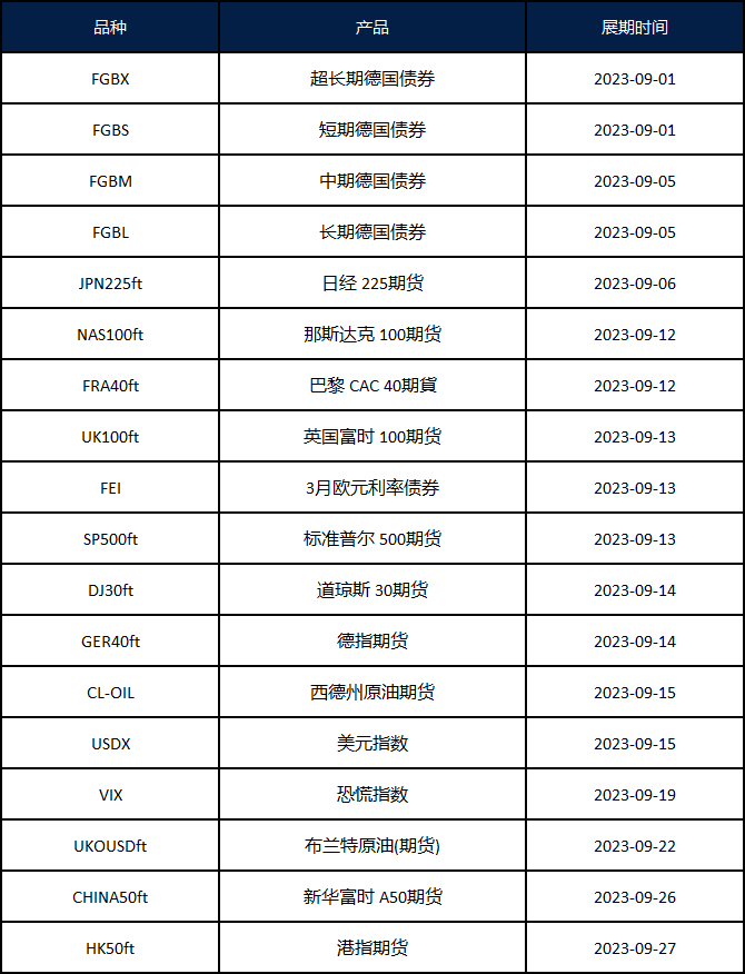 VT Markets 平台的期货产品:FGBX (超长期德国债券) , FGBS (短期德国债券) , FGBM (中期德国债券) , FGBL (长期德国债券) , JPN225ft (日经 225期貨) , UK100ft (英国富时 100期货) , NAS100ft (那斯达克 100期货) , FRA40ft (巴黎 CAC 40期貨) , FEI (3月欧元利率债券) , SP500ft (标准普尔 500期货) , DJ30ft (道琼斯 30期货) , GER40ft (德指期货) , CL-OIL (西德州原油期货) , USDX (美元指数) , VIX (恐慌指数) , UKOUSDft (布兰特原油期货) , CHINA50ft (新华富时 A50期货) , HK50ft (港指期货) 即将于以下时间展开新合约,如持仓过夜将会收取展期费用。