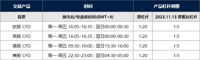 1. 收盘前30分钟和开市后30分钟内开立新仓位的杠杆为1:5,一旦这些仓位不在前述提到的时间范围内,杠杆将恢复为原先1:20,且不会再次更动为1 :5