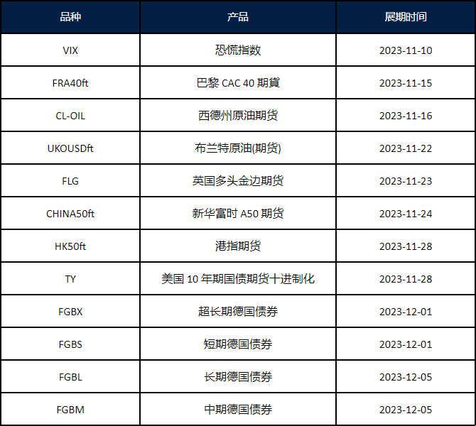 VT Markets平台的期货产品:VIX(恐慌指数)、FRA40ft(法国40指数期货)、CL-OIL(西德克萨斯原油期货)、UKOUSDft(布伦特原油期货)、FLG (英国多头金边期货) , CHINA50ft (新华富时 A50 期货) , HK50ft (港指期货) , TY (美国 10 年期国债期货十进制化) , FGBX (超长期德国债券) , FGBS (短期德国债券) , FGBL (长期德国债券) , FGBM (中期德国债券) ,新合约将于以下时间推出, 如果持仓过夜,将收取展期费用。