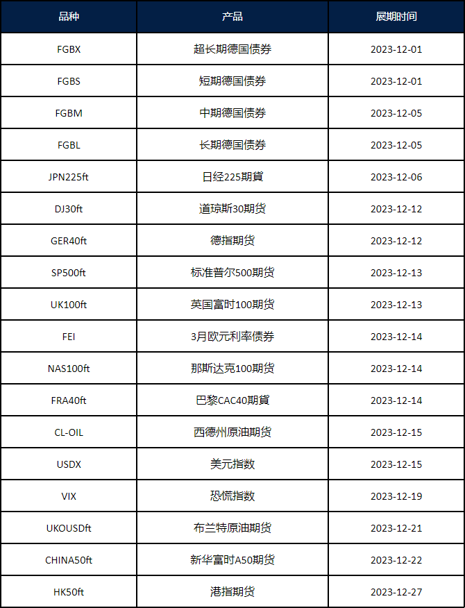 VT Markets 平台的期货产品:FGBX(超长期德国债券),FGBS(短期德国债券),FGBM(中期德国债券),FGBL(长期德国债券),JPN225ft(日经225期貨),DJ30ft(道琼斯30期货),GER40ft(德指期货),SP500ft(标准普尔500期货),UK100ft(英国富时100期货),FEI(3月欧元利率债券),NAS100ft(那斯达克100期货),FRA40ft(巴黎CAC40期貨),CL-OIL(西德州原油期货),USDX(美元指数),VIX(恐慌指数),UKOUSDft(布兰特原油期货),CHINA50ft(新华富时A50期货),HK50ft(港指期货) 即将于以下时间展开新合约,如持仓过夜将对换约造成的额外盈亏进行扣补。