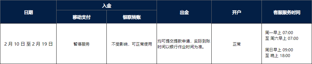 2. 春节期间,入金不受影响,仅移动支付暂停服务。