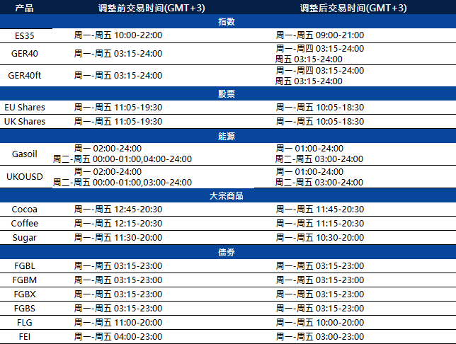 由于欧洲/英国地区即将由冬令时切换至夏令时,部份产品的交易时间将于 2024年03月31日有所调整,详情如下: