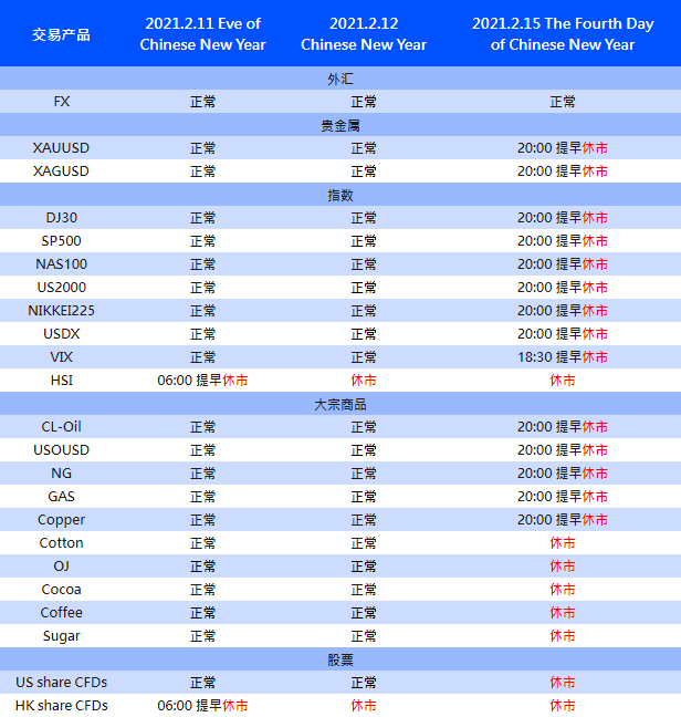 受亚洲国家节假日(Eve of Chinese New Year ,Chinese New Year,The Fourth Day of Chinese New Year)影响,VT Markets 部分产品交易时间将有所调整,详情请查看如下: