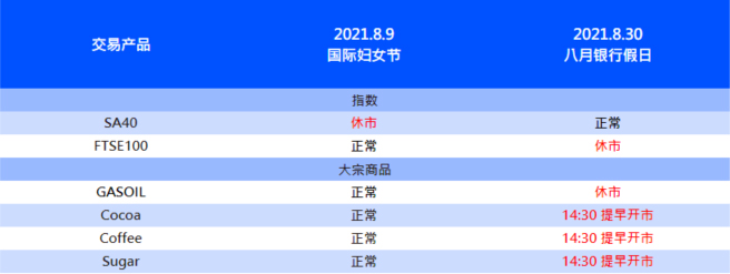 受国际妇女节、八月银行假日影响,VT Markets 部分产品交易时间将有所调整,详情请查看如下: