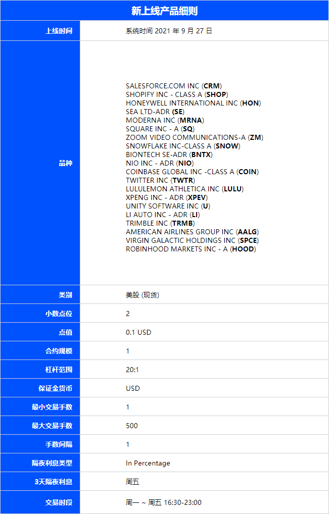 VT Markets 为进一步丰富广大客户的投资选择,我们将于 2021 年 09 月 27 日 (周一) 新增 20 只的美股 CFD 产品。