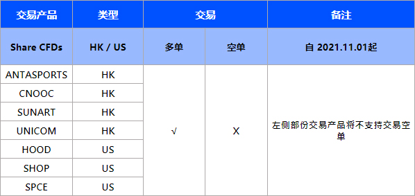VT Markets 致力于提供客户良好的交易环境,经过谨慎评估,自2021年11月1日起,部份产品将调整为仅支持多头仓位的开设,不支持新开空头仓位;既有的空头仓位则只支持平仓。