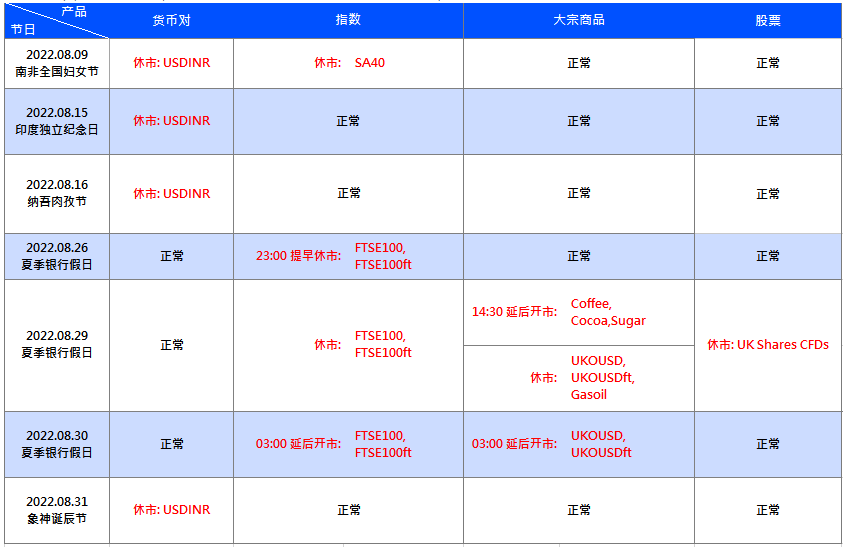 受到 8 月国际节假日影响,VT Markets 部分产品交易时间将有所调整,详情请查看如下: