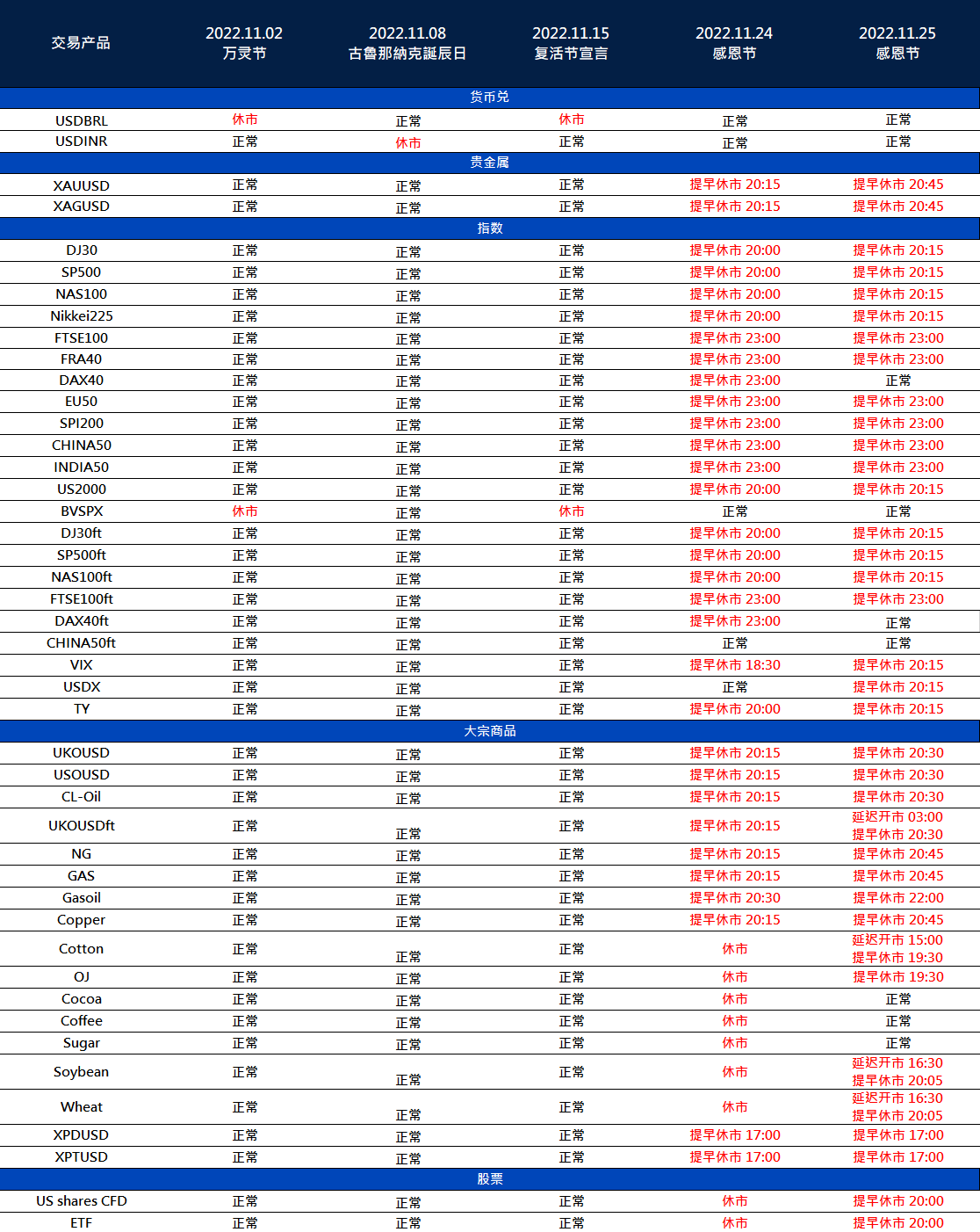 受到 11 月国际节假日影响,VT Markets 部分产品交易时间将有所调整,详情请查看如下: