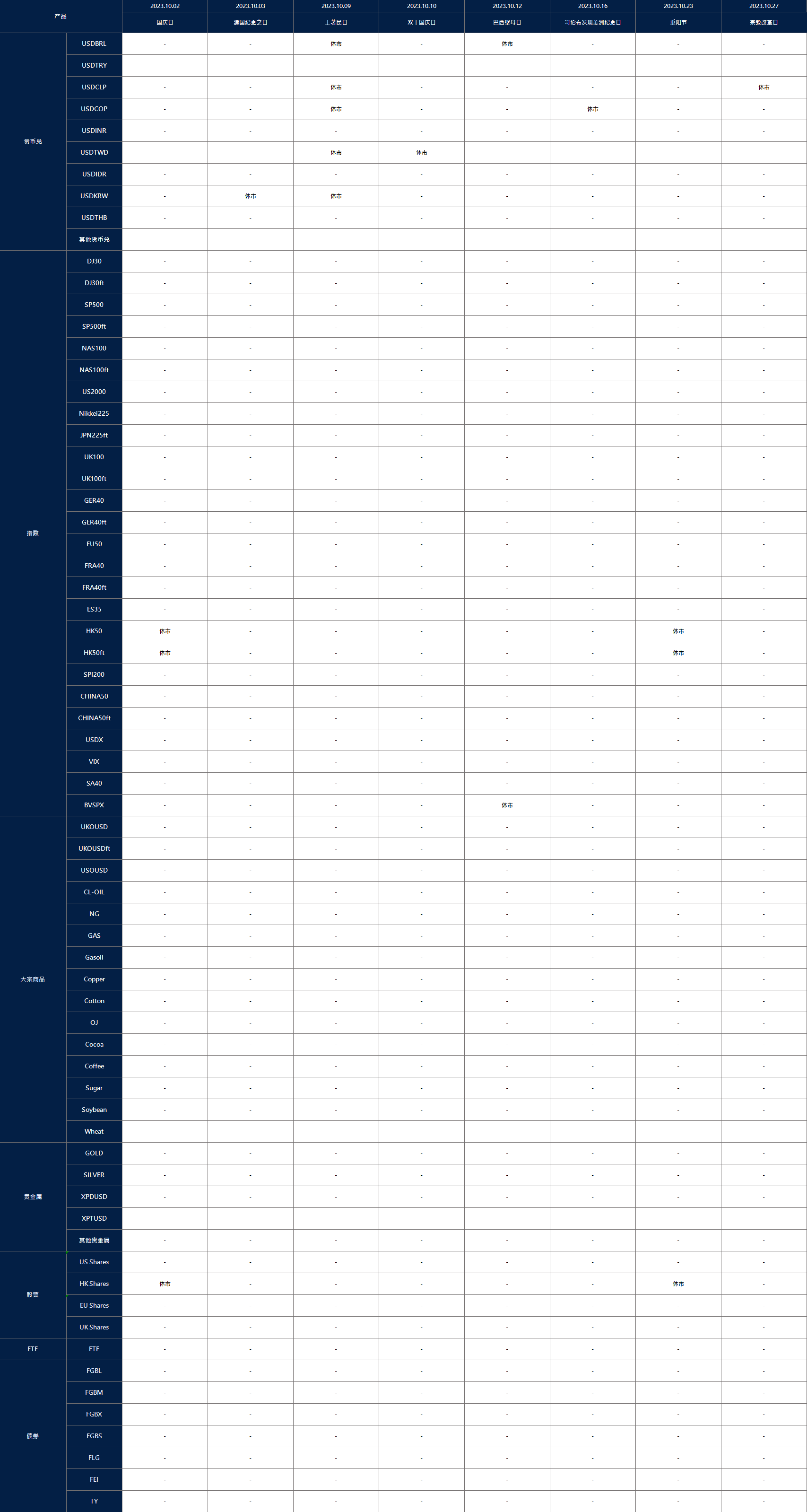 以上时间为MT4/5服务器时间,其他产品交易时间不受影响,在极少数情况下,以上信息可能会因流通性供应商的调整而变化,具体请以MT4/5实际交易时间为准。