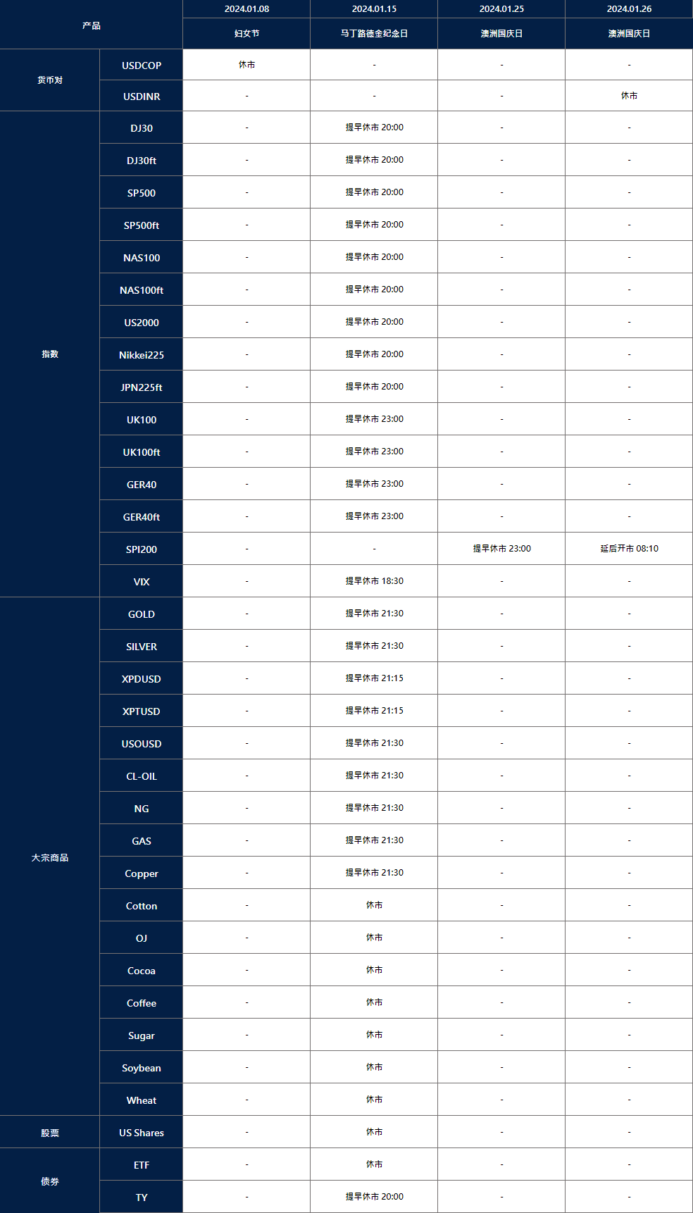 受到国际节假日影响,VT Markets 部份产品交易时间将有所调整。其余节假日受影响产品请见以下链接: