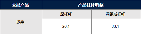 1. 全部股票产品丛原杠杆 20:1 调整为全时段 33:1。