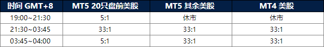 2. MT5 20 只盘前可交易的美股:盘前交易时段 19:00-21:30 与收盘前 15 分钟03:45-04:00 杠杆为 5:1,其他时段杠杆为 33:1。