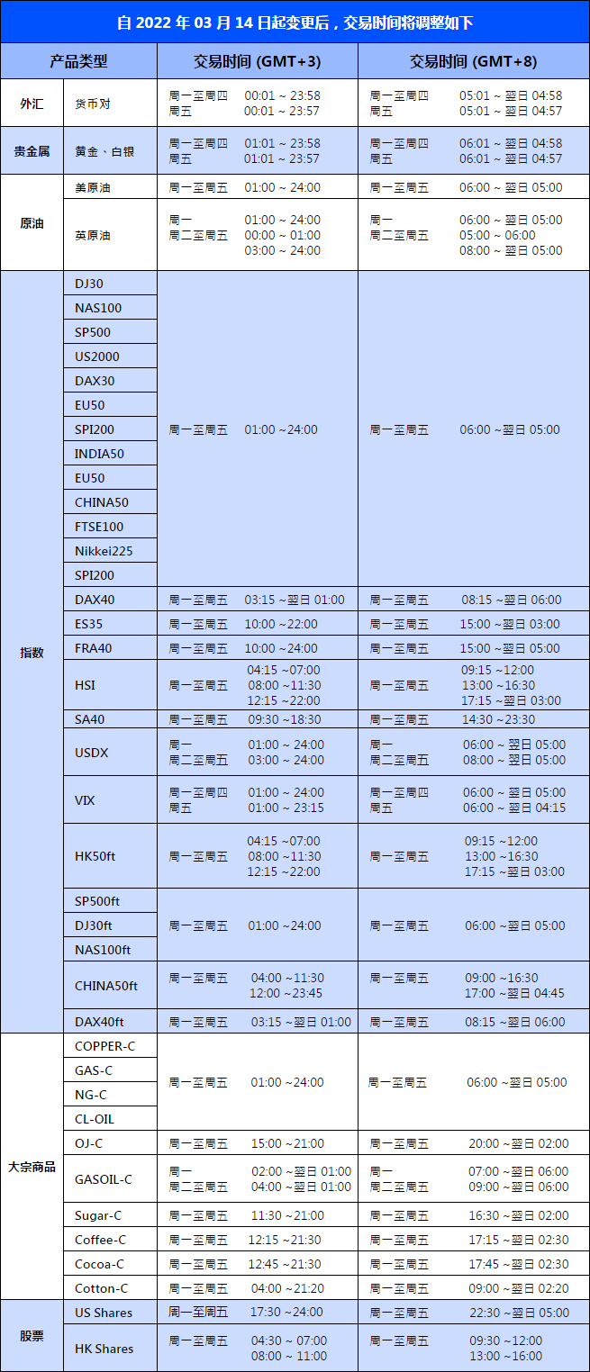 部份产品的交易时间将会有所调整,请查看如下: