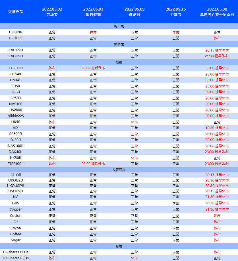 受到 5 月国际节假日影响,VT Markets 部分产品交易时间将有所调整,详情请查看如下: