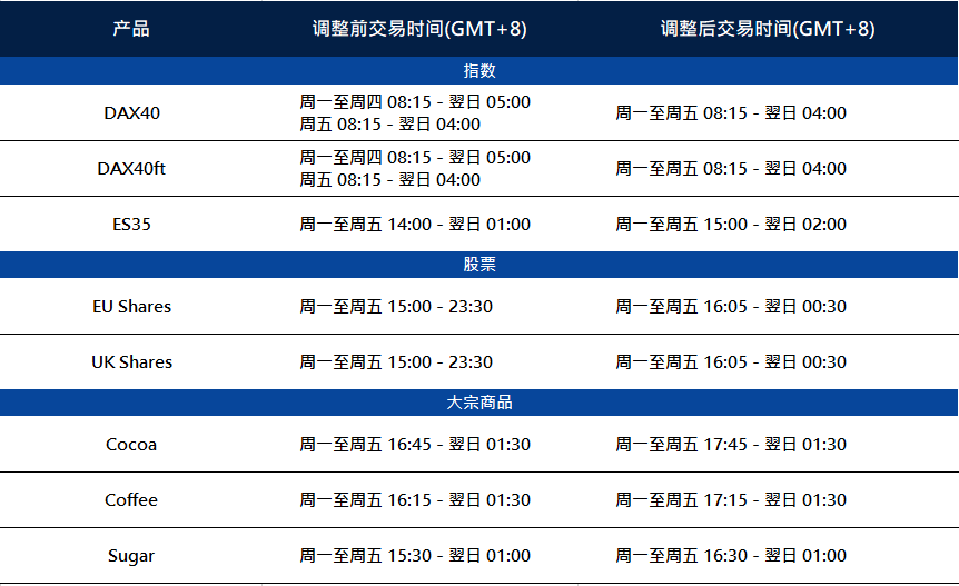部份受影响产品的交易时间将会有所调整,请查看如下: