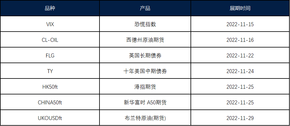 VT Markets 平台的期货产品:CL-OIL (西德州原油期货)、VIX (恐慌指数) 、CHINA50ft (新华富时A50期货) 、HK50ft (港指期货) 、UKOUSDft (布兰特原油期货) 、FLG(英国长期债券)、TY(十年美国中期债券)、即将于以下时间展开新合约,如持仓过夜将会收取展期费用。