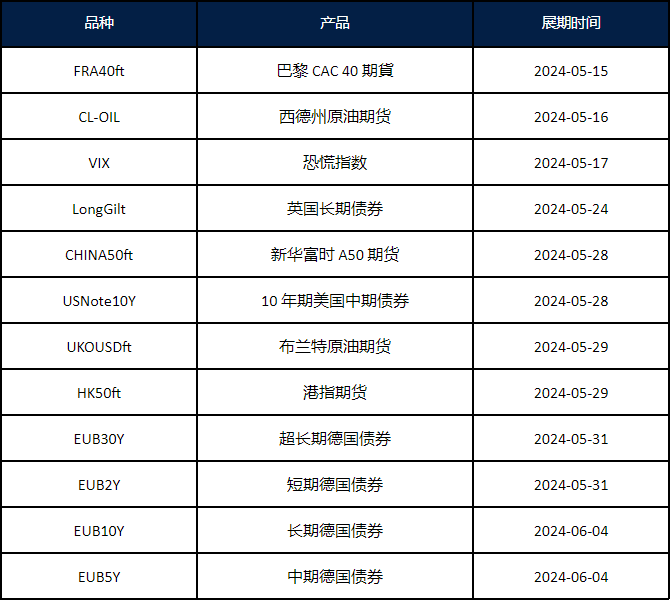 VT Markets 平台的部份期货产品即将于以下时间展开新合约,如持仓过夜将对换约造成的额外盈亏进行扣补。详情请见下方表格: