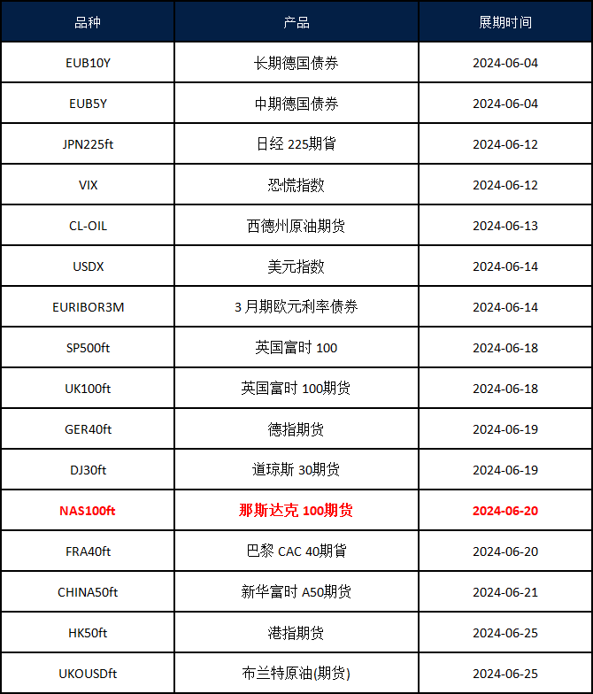 VT Markets 平台的部份期货产品即将于以下时间展开新合约,如持仓过夜将对换约造成的额外盈亏进行扣补。详情请见下方表格: