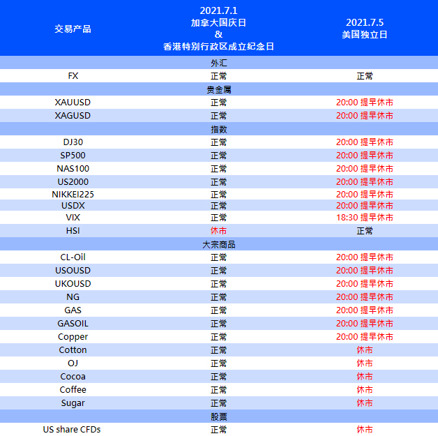 受加拿大国庆日&香港特别行政区成立纪念日、美国独立日影响,VT Markets 部分产品交易时间将有所调整,详情请查看如下: