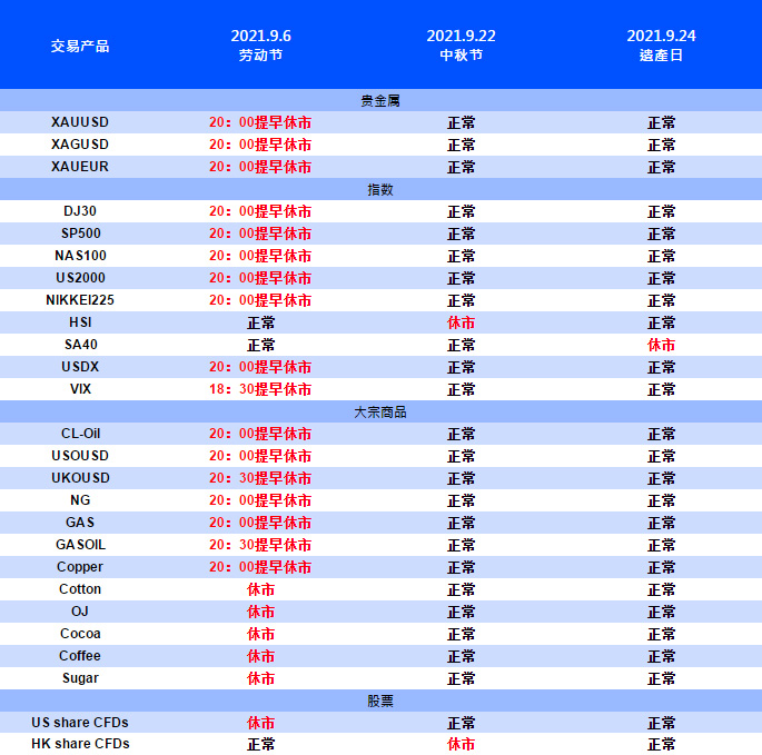 受劳动节、中秋节、遗产日影响,VT Markets 部分产品交易时间将有所调整,详情请查看如下: