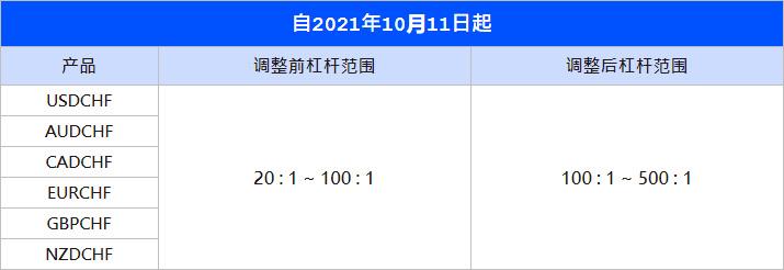 VT Markets 将于 2021 年 10 月 11 日调升所有瑞郎系货币兑的杠杆范围,具体调整内容如下: