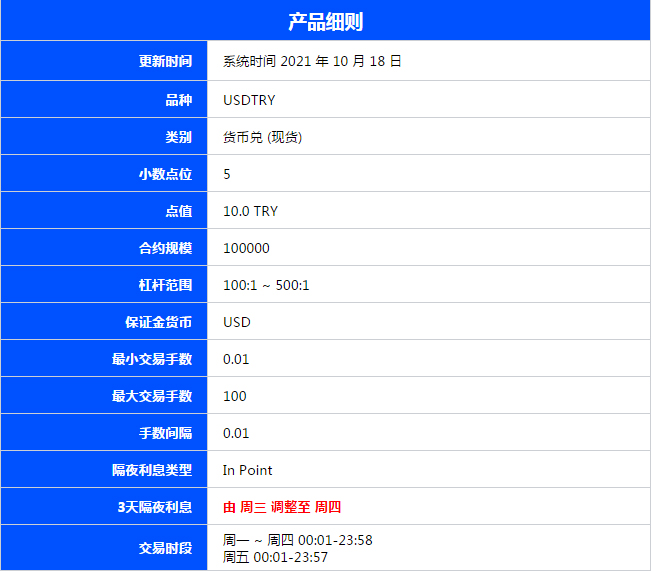 为了更准确地反映市场动态,VT Markets 将于 2021 年 10 月 18 日调整美元兑土耳其里拉 (USDTRY) 的三日库存费设置。