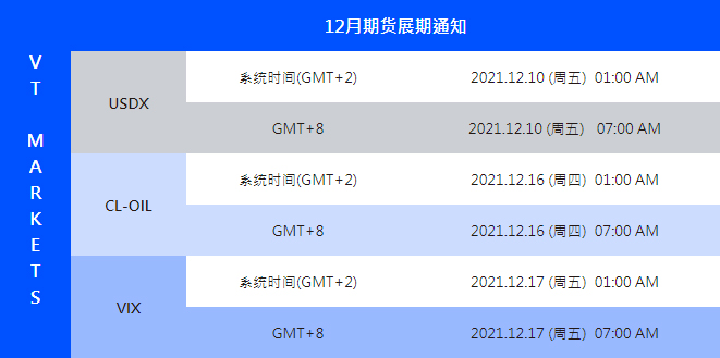 VT Markets 平台的期货产品:CL-OIL(原油期货)、USDX(美元指数)、VIX(波动率指数)即将于以下时间展开新合约,如持仓过夜将会收取展期费用。