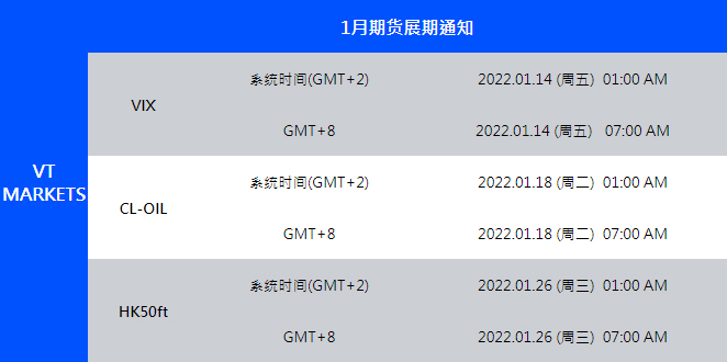 VT Markets 平台的期货产品:CL-OIL(原油期货)、HK50ft(香港恒生50期货)、VIX(波动率指数)即将于以下时间展开新合约,如持仓过夜将会收取展期费用。