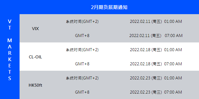 VT Markets 平台的期货产品:VIX(波动率指数)、CL-OIL(原油期货)、HK50ft(香港恒生50期货)、即将于以下时间展开新合约,如持仓过夜将会收取展期费用。