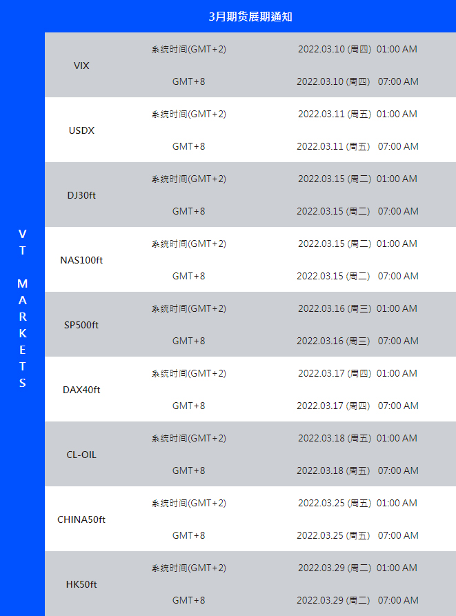 VT Markets 平台的期货产品:VIX(波动率指数)、CL-OIL(原油期货)、HK50ft(香港恒生50期货)、USDX(美元指数)、DJ30ft(道琼30期货)、NAS100ft(那斯达克100期货)、SP500ft(标准普尔500期货)、DAX40ft(德国40期货)、CHINA50ft(新华富时50期货)即将于以下时间展开新合约,如持仓过夜将会收取展期费用。