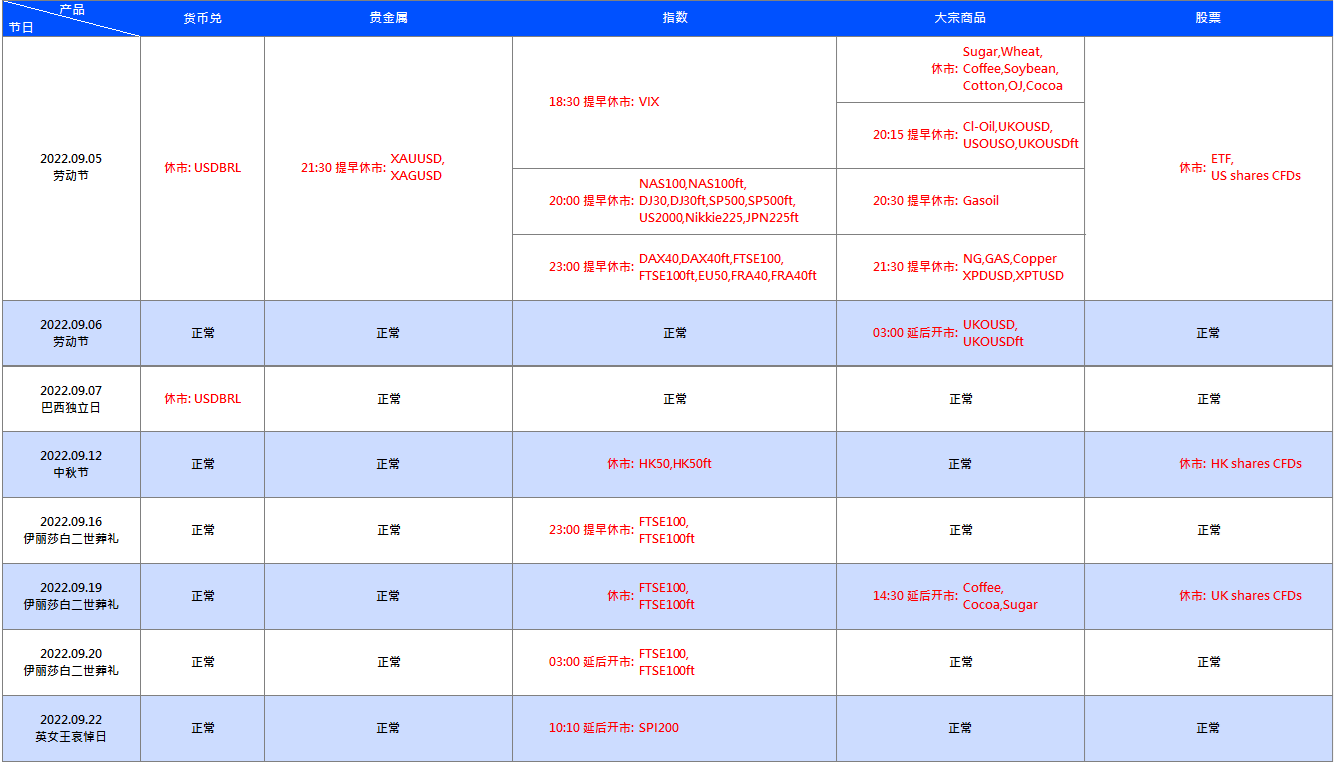 受到 9 月国际节假日影响,VT Markets 部分产品交易时间将有所调整,详情请查看如下: