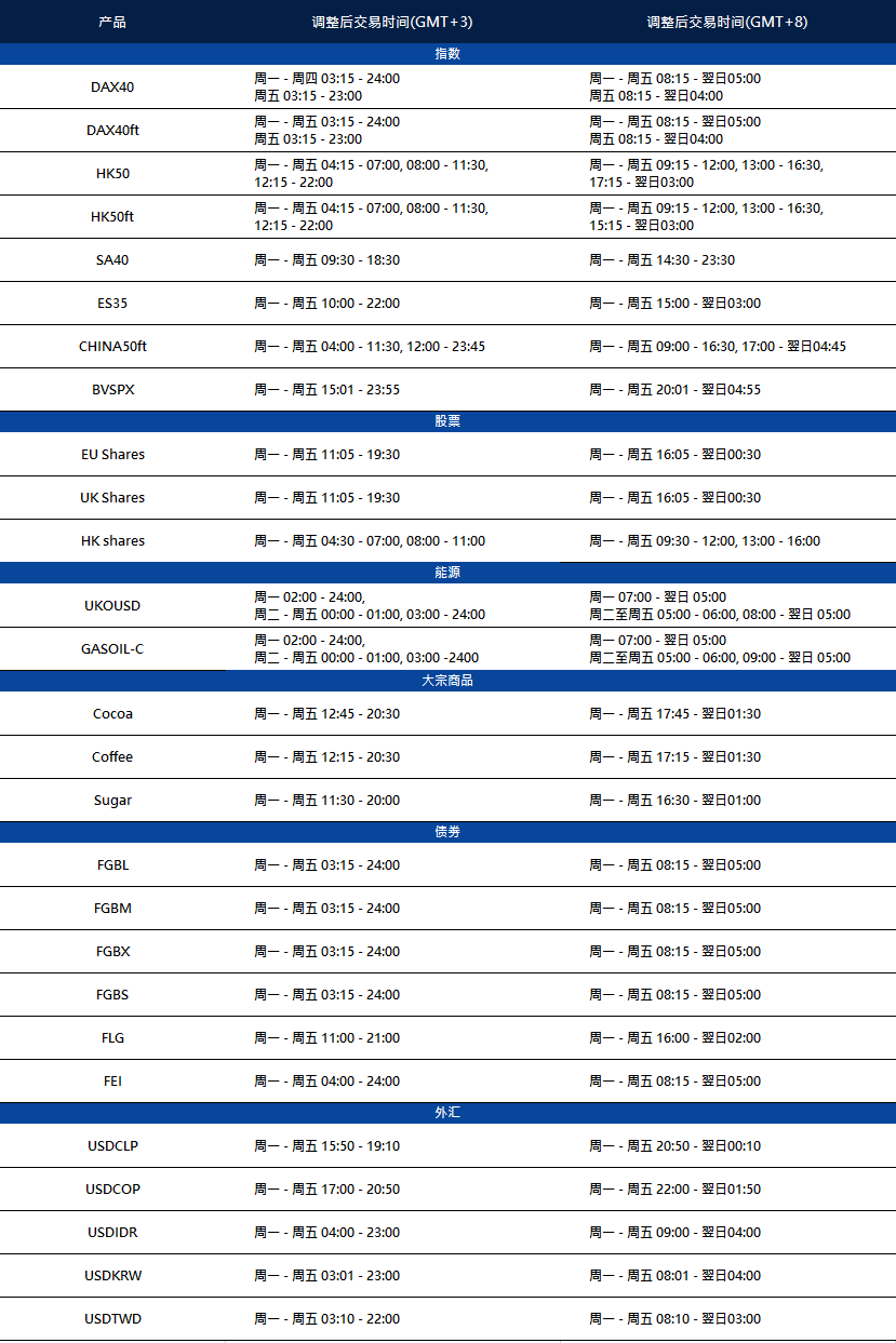 您好!VT Markets将在 2023年3月12日 自冬令时切换为夏令时 。于夏令时 MT4/5 系统时间 GMT+3,于系统时间自行加上5小时即可换算为GMT+8时间。部份产品的交易时间将会有所调整,请查看如下: