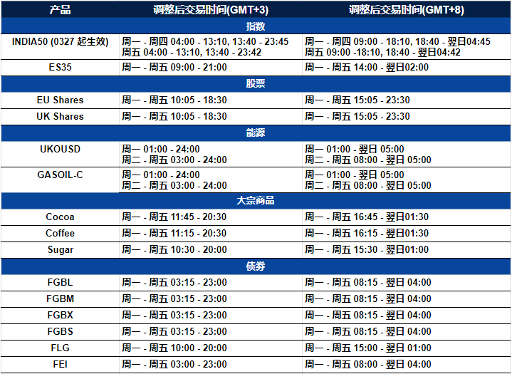 部份产品的交易时间设置受日光节约时间等因素影响,将于 03/26、03/27 调整。详情如下表: