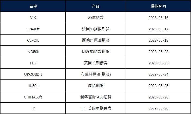 VT Markets 平台的期货产品:VIX(恐慌指数)、FRA40ft(法国40指数期货)、CL-OIL(西德州原油期货)、IND50ft(印度50指数期货)、FLG(英国长期债券)、UKOUSDft(布兰特原油(期货) )、HK50ft(港指期货)、CHINA50ft(新华富时 A50期货)、TY(十年美国中期债券)即将于以下时间展开新合约,如持仓过夜将会收取展期费用。