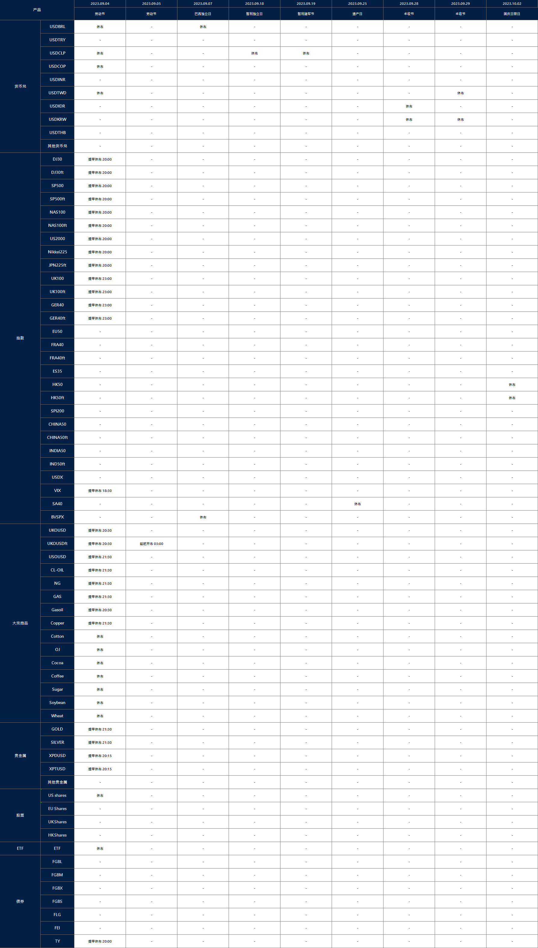 以上时间为MT4/5服务器时间,其他产品交易时间不受影响,在极少数情况下,以上信息可能会因流通性供应商的调整而变化,具体请以MT4/5实际交易时间为准。